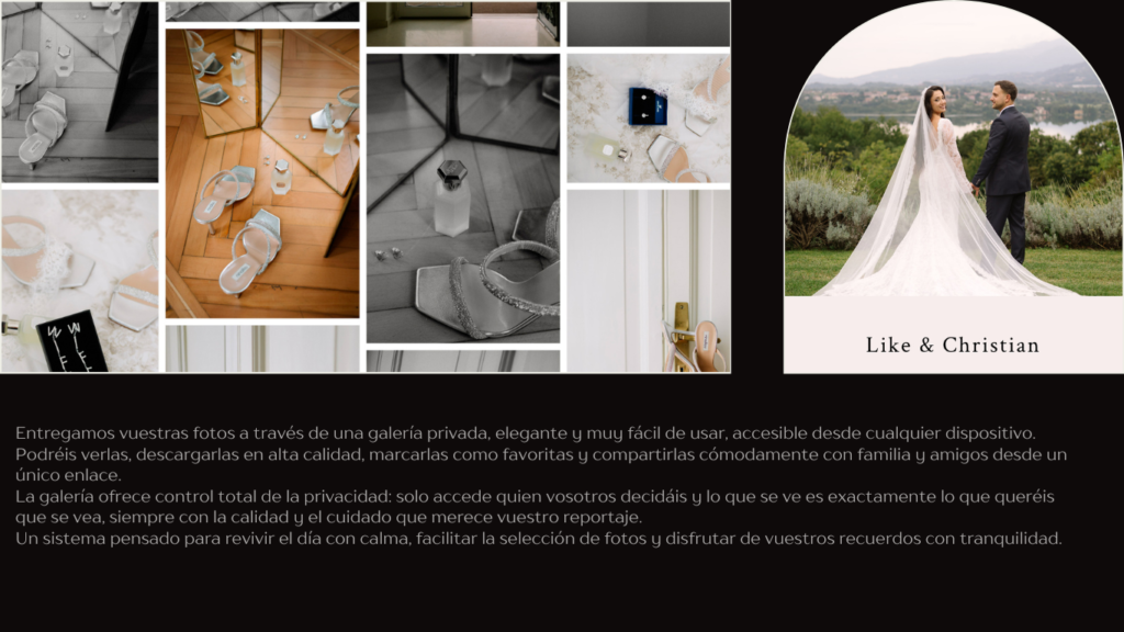 Tanto en el adelanto como en la entrega final tendréis una galería online privada para compartir las fotos con vuestros seres queridos.